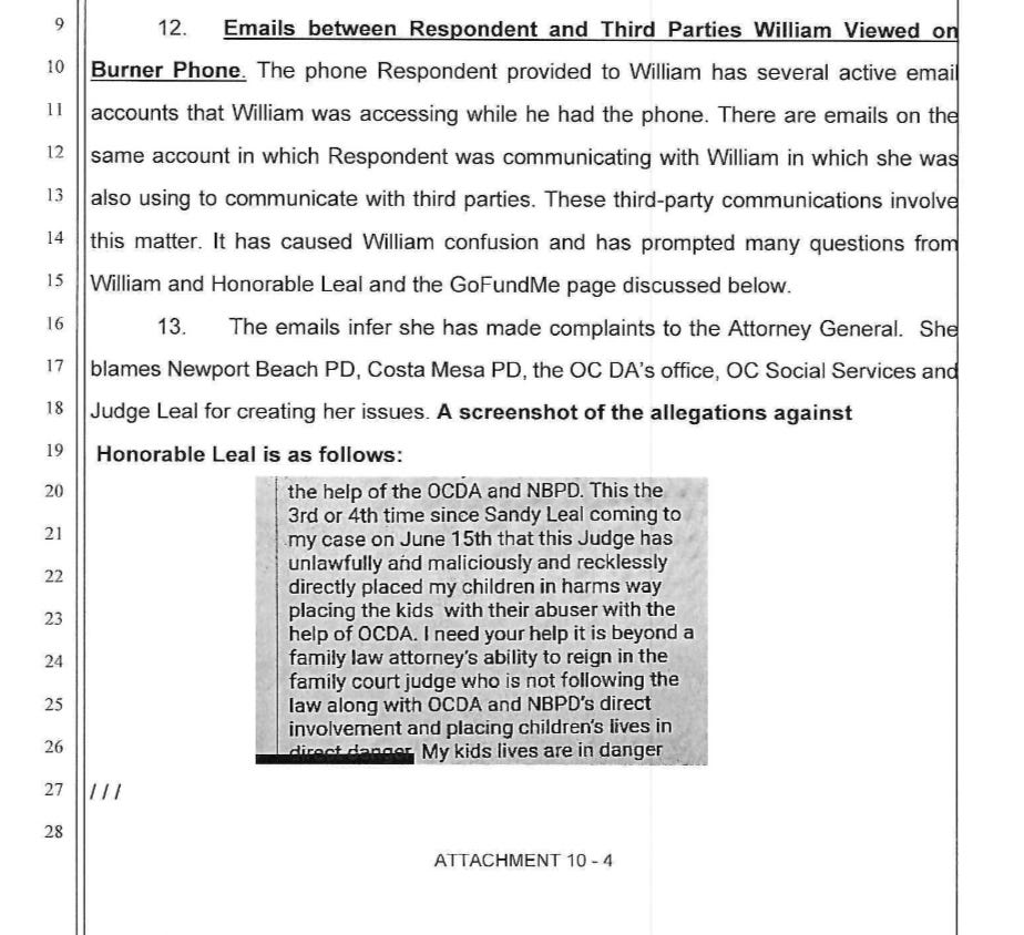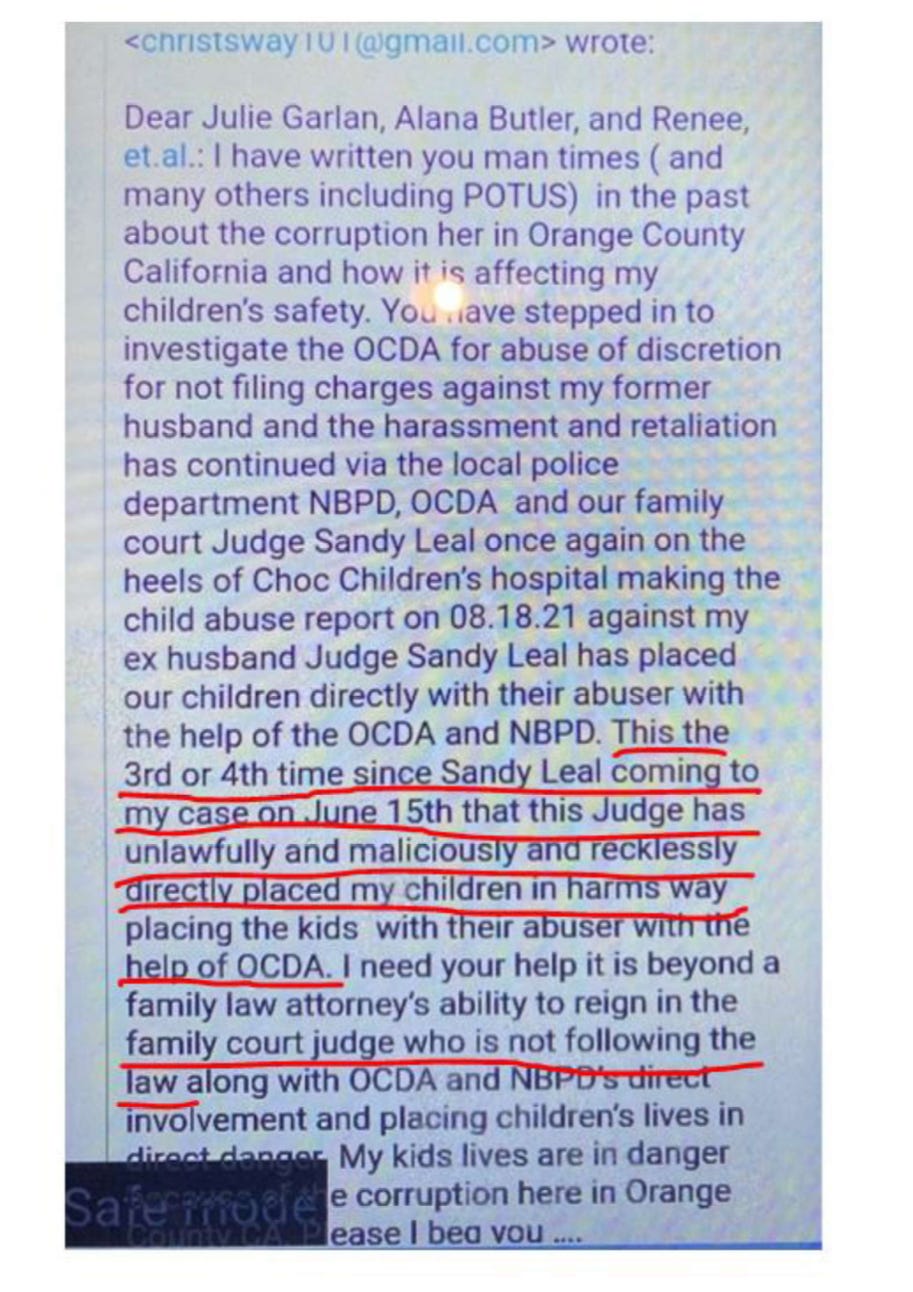 In June 2021, newly assigned Judge Sandra Leal held a non-noticed, secret hearing with Jacobs, Faria, and Fletcher. They submitted fraudulent declarations and obtained warrants to seize my children, while we were still waiting for a hearing on the March assault.