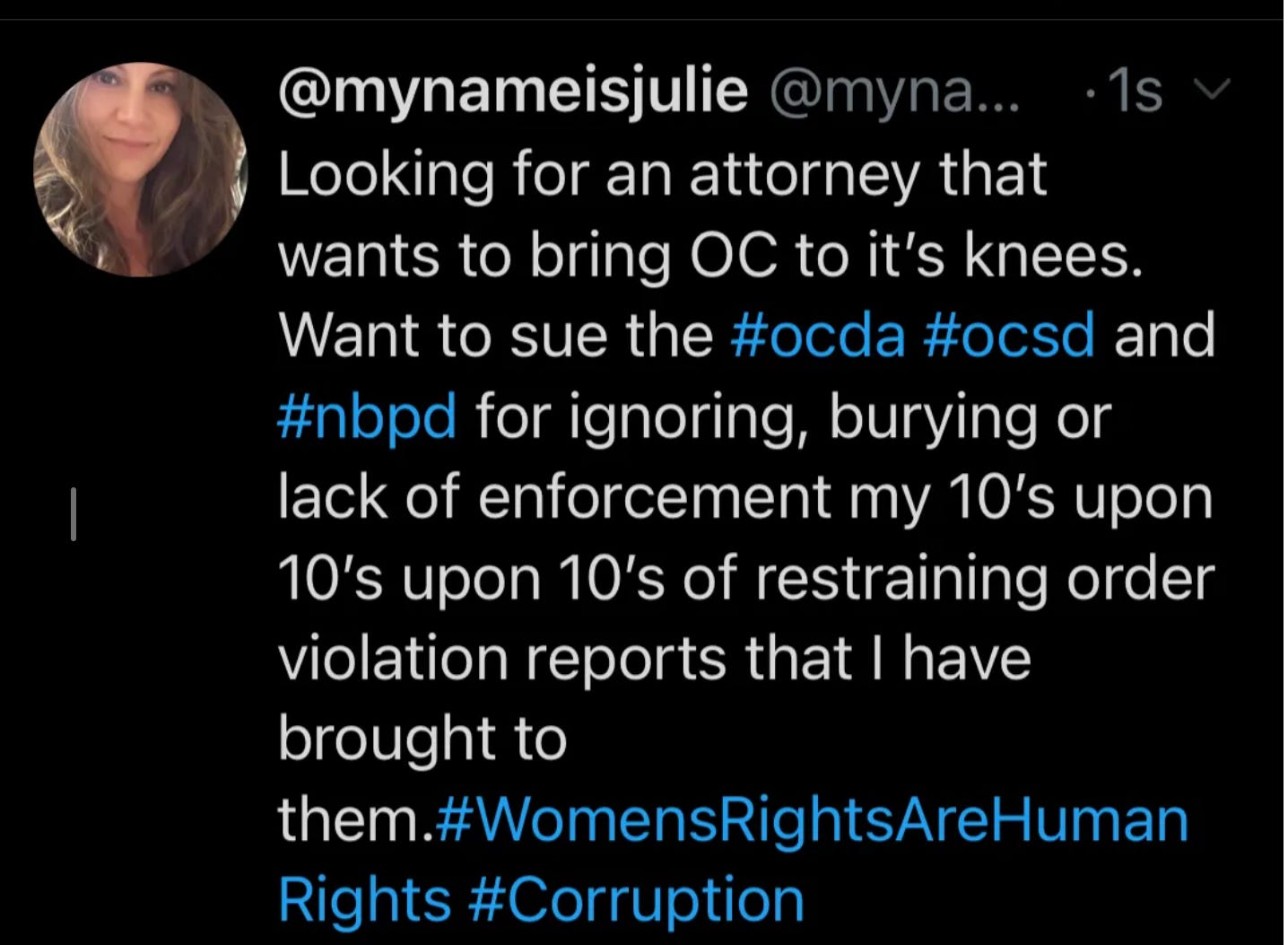 In November 2020, shortly after a tweet that apparently angered some in power, I was told by Newport Beach Police—while attempting to report a restraining order violation—that the Orange County District Attorney’s Office had directed them not to take any more violation reports from me unless my ex-husband explicitly threatened to kill me.