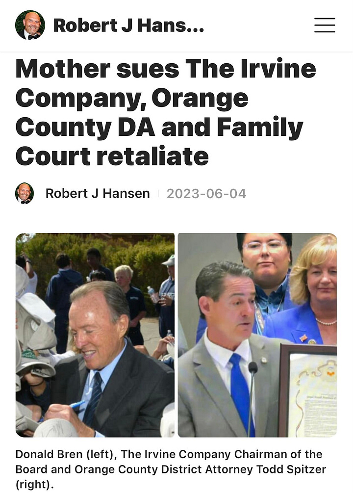 Mother sues The Irvine Company, Orange County DA and Family Court retaliate